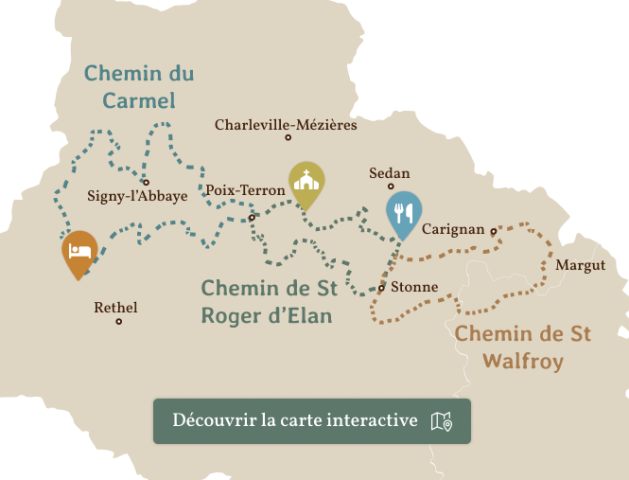 Partez à la découverte des Chemins des Saints Ardennais grâce à notre carte interactive, conçue pour vous guider avant et pendant votre marche. Visualisez les itinéraires, les étapes et les lieux emblématiques le long des trois premiers chemins : le Chemin de Saint Roger, le Chemin de Saint Walfroy et le Chemin du Carmel.